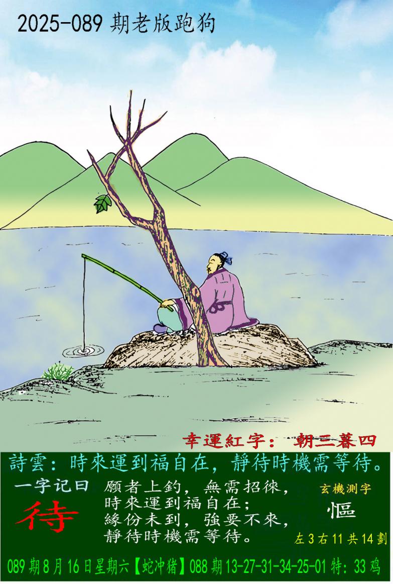 089期老版跑狗一字記之曰:【待】 詩雲:時來運到福自在,靜待時機需等待。