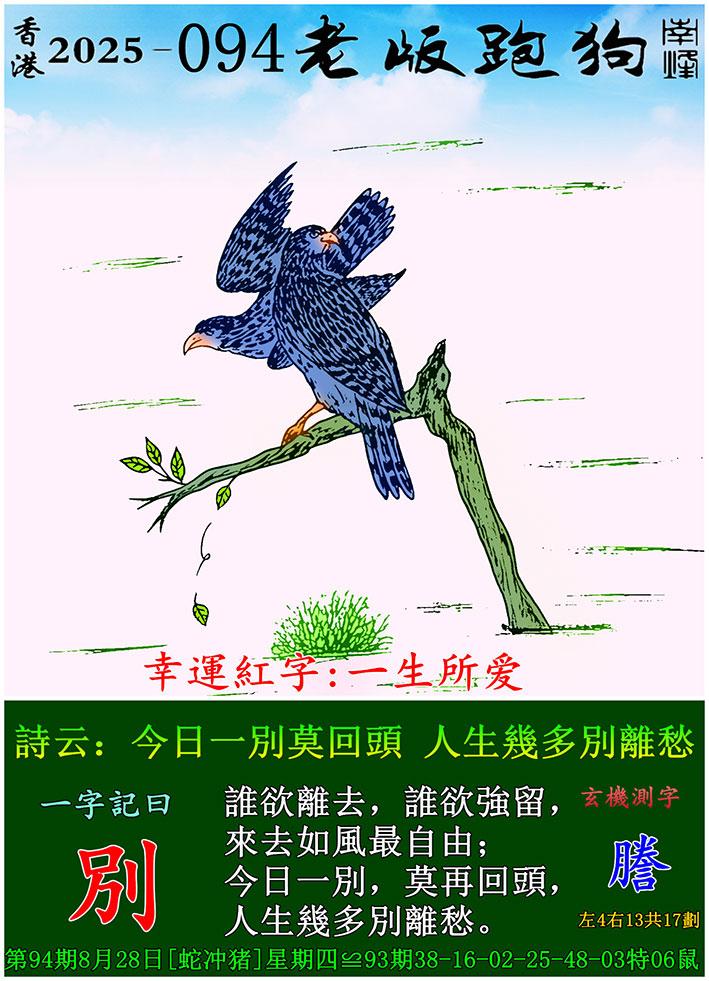 094期老版跑狗一字記之曰:【別】 詩雲:今日一別莫回頭,人生幾多別離愁。