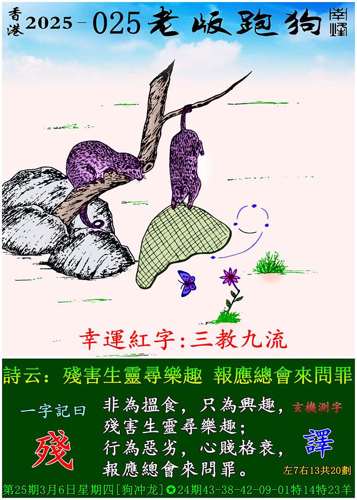 025期老版跑狗一字記之曰:【殘】 詩雲:殘骸生靈尋樂趣,報應總會來問罪。