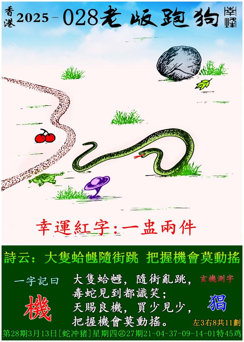 028期老版跑狗一字記之曰:【機】 詩雲:大隻蛤乸隨街跳,把握機會莫動搖。