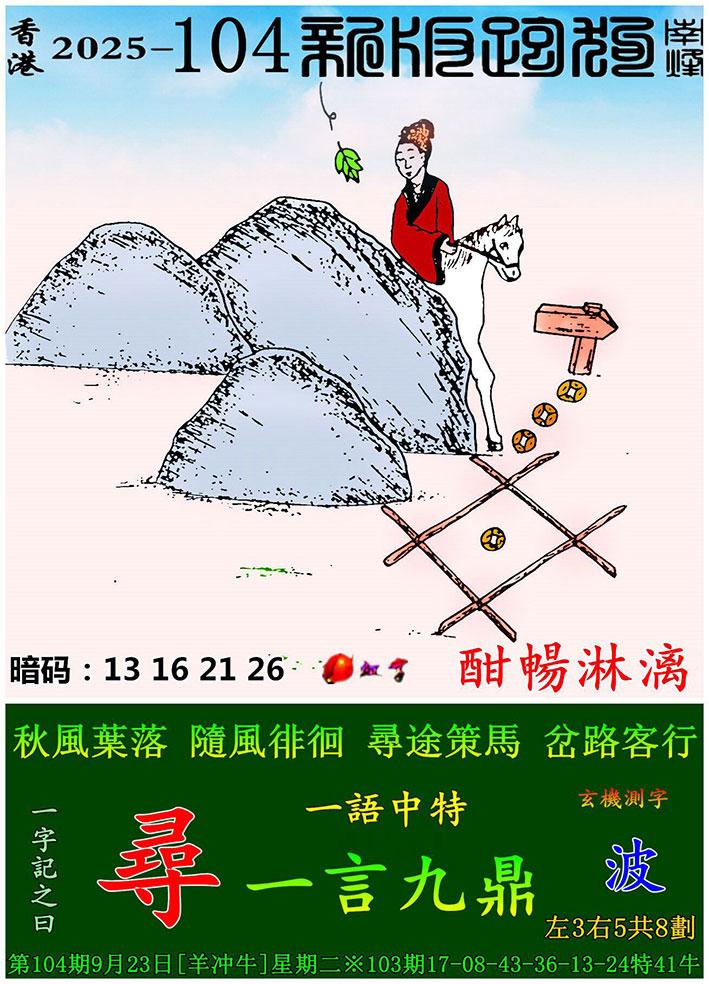 104期新版跑狗一字記之曰:【尋】 玄機測字:《波》 一語中特:一言九鼎