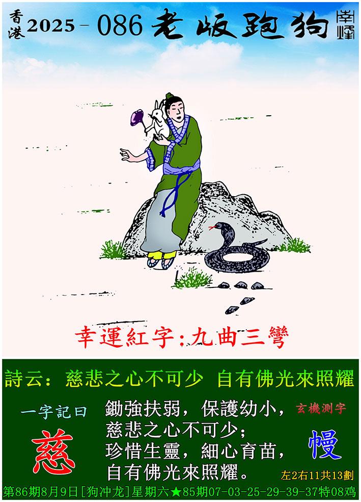 086期老版跑狗一字記之曰:【慈】 詩雲:慈悲之心不可少,自有佛光來照耀。