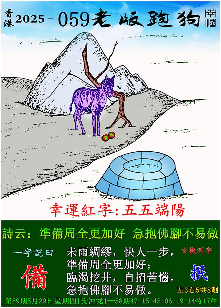059期老版跑狗一字記之曰:【備】 詩雲:準備周全更加好,急抱佛腳不易做。