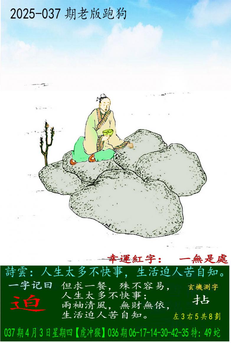 037期老版跑狗一字記之曰:【迫】 詩雲:人生太多不快事,生活迫人苦自知。