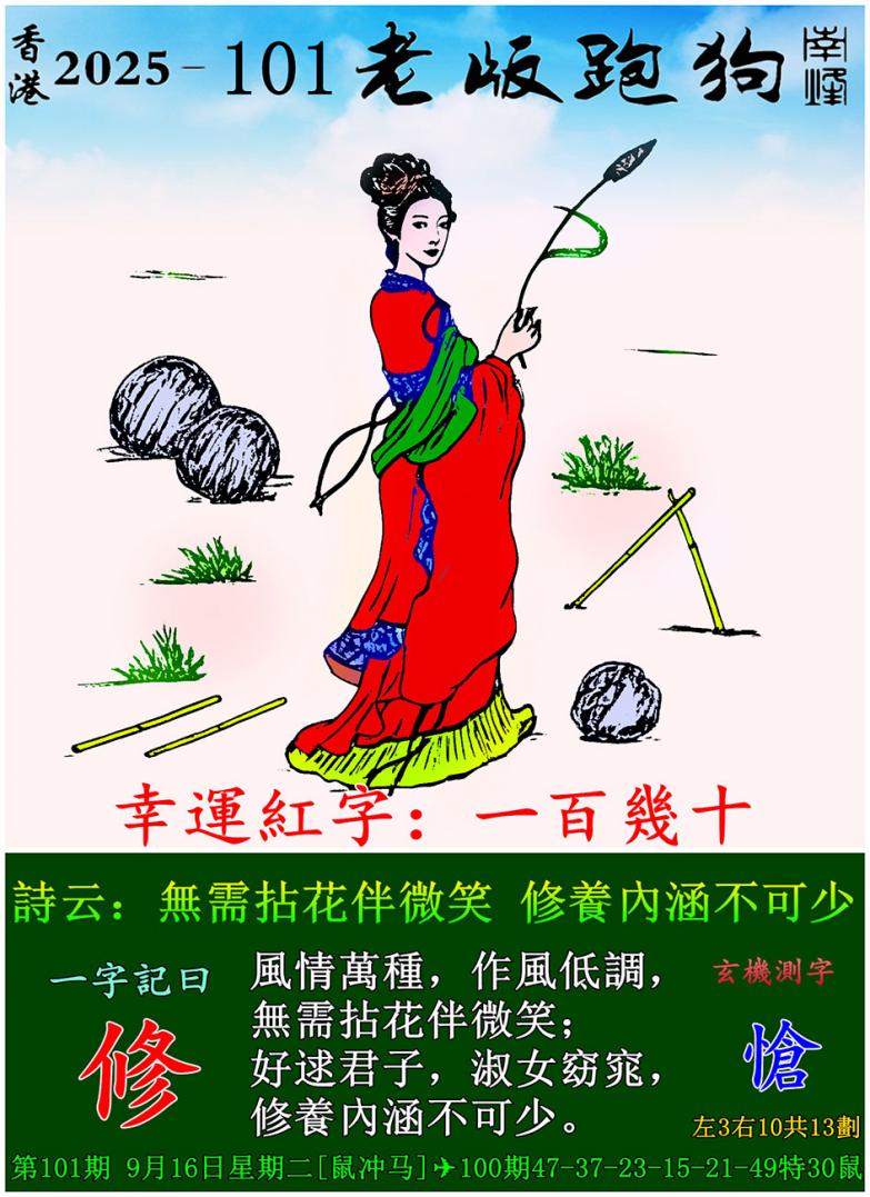 101期老版跑狗一字記之曰:【修】 詩雲:無需拈花伴微笑,修養內涵不可少。